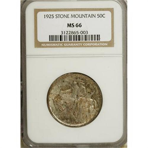 <B>1925 50C Stone Mountain MS66 NGC.</B></I> NGC Census: (587/135). PCGS Population (700/169). Mintage: 1,314,709. Numismedia Wsl. Price for NGC/PCGS coin in MS66: $320. (#9378)<BR><BR><b>Shipping:</b> Coins & Currency (<a target="_blank" href="http://www.heritageauctions.com/common/shipping.php">view shipping information</a>)