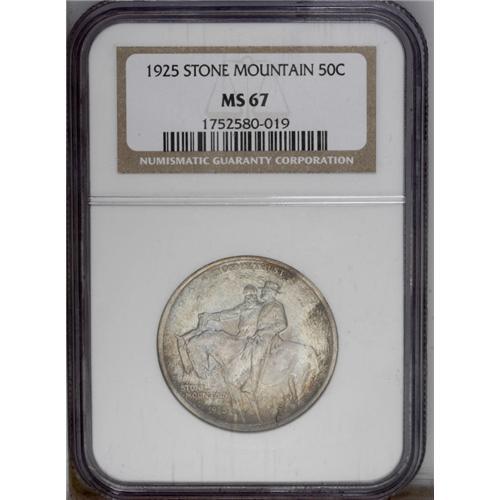 <B>1925 50C Stone Mountain MS67 NGC.</B></I> Frosty and lustrous beneath pastel blue, pink, green, and gold color. Impeccable quality and surely in demand at this grade level.