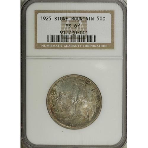 <B>1925 50C Stone Mountain MS67 NGC.</B></I> Richly toned in mottled shades of gold, lavender, green, violet, and orange color. Well struck with good luster and seemingly pristine surfaces. A spectacular Superb Gem. Population: 45 in 67, 5 finer (9/01).<BR><BR><b>Shipping:</b> Coins & Currency (<a target="_blank" href="http://www.heritageauctions.com/common/shipping.php">view shipping information</a>)