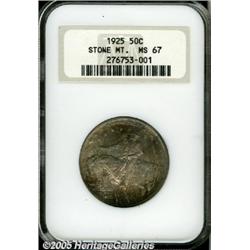 <B>1925 50C Stone Mountain MS67 NGC.</B></I> This is a pleasingly frosted example with pinpoint striking definition throughout. The color is truly spectacular with overlays of mottled antique-copper patina atop silver-gray toning on the obverse. The latter color also dominates on the reverse, but that side exhibits vivid lilac and emerald-green shadings at the upper border that add immeasurably to the already impressive eye appeal. A coin whose aesthetic beauty would be difficult to improve upon. The ER in SOLDIER is lightly die doubled.