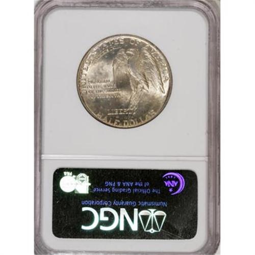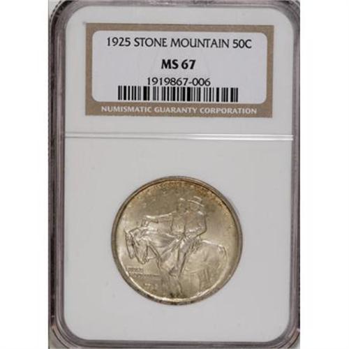 <B>1925 50C Stone Mountain MS67 NGC.</B></I> Splashes of peach-gold toning accent the silver-white of the strongly lustrous surfaces. Solidly struck with excellent preservation and remarkable eye appeal. NGC has graded only 10 finer pieces (10/07).<BR><BR><b>Shipping:</b> Coins & Currency (<a target="_blank" href="http://www.heritageauctions.com/common/shipping.php">view shipping information</a>)