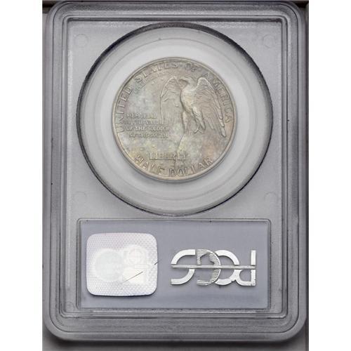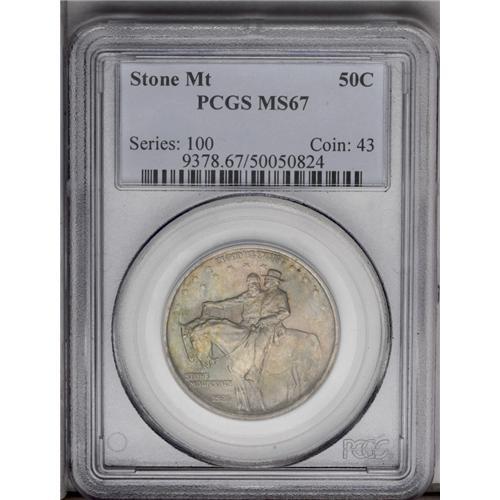 <B>1925<50C> Stone Mountain MS67 PCGS.</B></I> A wonderfully preserved example exhibiting soft, pastel shades of pink, green, yellow, and gray in alternating designs on each side. A hint of striking softness along the reverse border is of no importance. SOLDIER and nearby legends are lightly die doubled south.