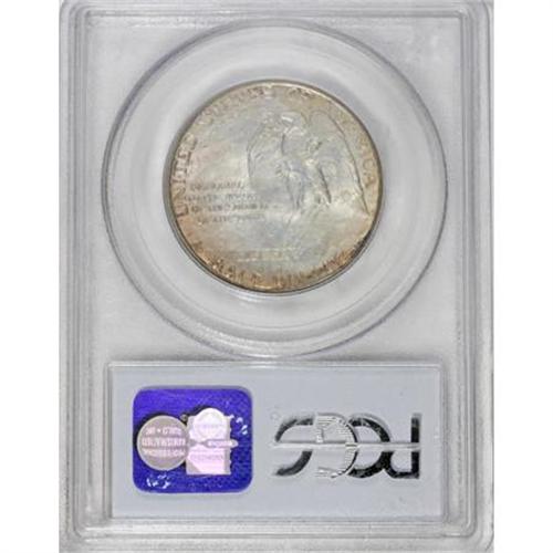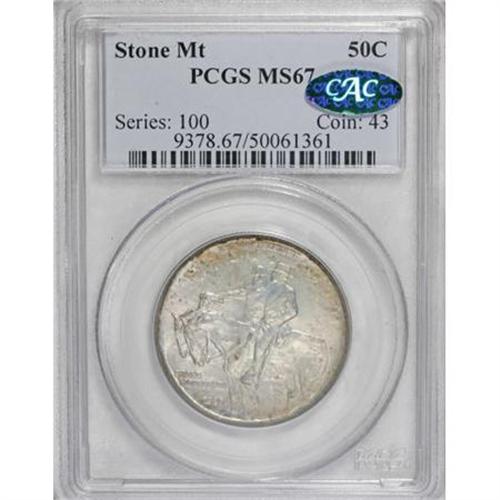 <B>1925 50C Stone Mountain MS67 PCGS. CAC.</B></I> Although Stone Mountain commemoratives are common in an absolute sense, it is most unusual to find one as nice as this piece... unless you are looking in a Heritage Signature Auction. The surfaces of this coin bear an interesting toning pattern ranging from cream to flecks of sea green, blue, and even violet. Luster is, of course, full, and the surfaces have the minimal marks expected for a coin of the grade.<BR><BR><b>Shipping:</b> Coins & Currency (<a target="_blank" href="http://www.heritageauctions.com/common/shipping.php">view shipping information</a>)