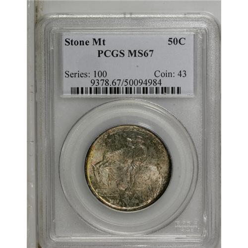 <B>1925 50C Stone Mountain MS67 PCGS.</B></I> Doubled Die Reverse. Lovely gold, sea-green, apricot, and pearl-gray patina endows this highly lustrous and boldly struck Superb Gem. The obverse is essentially pristine, and the reverse is well preserved. PCGS has graded just six coins finer (10/06).<BR><BR><b>Shipping:</b> Coin/Currency (<a target="_blank" href="http://www.heritageauctions.com/common/shipping.php">view shipping information</a>)