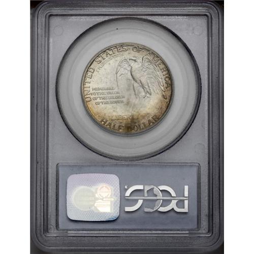 <B>1925<50C> Stone Mountain MS67 PCGS.</B></I> Pastel golden-tan and powder-blue patina overlie lustrous surfaces that display sharply struck design features. The faces are virtually mark free, though a couple of trivial hits are noted on the left obverse rims. Population: 159 in 67, 6 finer (3/06). <BR><BR><B>Important notice:</B> Heritage usually auctions material at the rate of 200-250 lots per hour. On some occasions eBay Live bid software or the Internet may not be able to keep up with the pace of the auction. We recommend placing a realistic absentee bid now as insurance to avoid disappointment. Occasionally the auctioneer may eliminate or reject an eBay Live bid, and the auctioneer may also reopen a lot after the close of the eBay live bidding (usually because we missed an audience bid), and may reject your bid even if it shows you as the winning bidder. By bidding via eBay Live, you agree that Heritage may award the lot to another bidder at its sole discretion under the circumstances described above or any other reasonable circumstances. Since eBay bids are not shown to us until we open the lot on the floor, we treat those bids just like floor bids. In most cases the floor responds before the eBay bid is presented to us, due to Internet lag time, so for consistency we have made it a policy that floor bids are always considered first over tie eBay live bids. Also please note that all Heritage lots purchased through eBay Live carry a 20% Buyer's Premium. Please make sure you read the Terms and Conditions before you bid. This lot is being auctioned in conjunction with a live floor auction by Heritage Galleries & Auctioneers. All final auction and invoice information will be supplied by Heritage Galleries & Auctioneers, and all other information should be considered preliminary. Lot:5090 <BR><BR><B>Winning Notification and Billing:</B> After the FINAL session in this auction is complete, Heritage will send e-mail and snail mail invoices. This process normally takes several days. All final auction and invoice information will be supplied by Heritage Galleries & Auctioneers, and all other information should be considered preliminary. <BR><BR>This auction will be conducted on a live auction floor and over the Internet through eBay Live. If you choose to place an absentee bid, please take a moment to <font color='#0000ff'><u><a href='http://pages.ebay.com/liveauctions/help/before/laabsentee.html'>learn how eBay Live absentee bidding works</a></u></font><font color='#000000'>