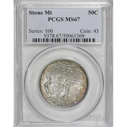 <B>1925 50C Stone Mountain MS67 PCGS.</B></I> Walnut-brown, olive-green, and plum-mauve hug the margins of this sharply struck and unabraded Superb Gem. Examples with the present quality are seldom encountered and PCGS has graded only six examples higher (12/07).<BR><BR><b>Shipping:</b> Coins & Currency (<a target="_blank" href="http://www.heritageauctions.com/common/shipping.php">view shipping information</a>)