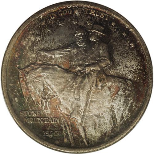 <B>1925 50C Stone Mountain MS68 NGC.</B></I> Certain scandals aside, the eminently forgettable President Warren G. Harding is most notable for dying in office. In navigating the Stone Mountain commemorative half through Congress, the bill's sponsors declared that it would be dedicated to the memory of the recently deceased statesman. As various rejected iterations of the half dollar design traveled from Gutzon Borglum to the Commission of Fine Arts and back, the tribute to Harding (a nod to the Louisiana Purchase/McKinley dollar?) became less and less apparent, and in the final version, neither his name nor his likeness appears on either side.<BR> Shimmering luster, slightly more potent on the reverse, graces each side of this richly toned representative. The obverse exhibits mottled burgundy, greenish-gold, and silver-gray patina, while the reverse displays reddish-gold and greenish-gray with a diagonal swath of milky color at the center. Of the 10 examples graded MS68 by NGC, only one has received the Star designation (4/07).<BR><I>From The Cary & Cheryl Porter Collection.</B></I><BR><BR><b>Shipping:</b> Coins & Currency (<a target="_blank" href="http://www.heritageauctions.com/common/shipping.php">view shipping information</a>)