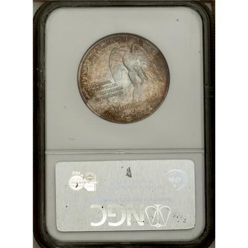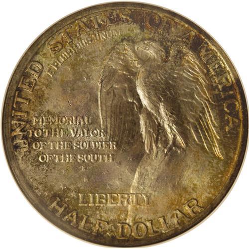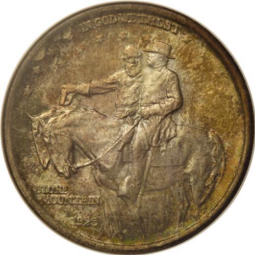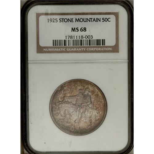 <B>1925<50C> Stone Mountain MS68 NGC.</B></I> Perhaps the ultimate Stone Mountain half dollar, this amazing Superb Gem has few peers, and is not exceeded by any example certified by either PCGS or NGC. Fully original surfaces display intermingled green, gold, lilac, and iridescent toning. Both sides are fully impressed, with complete details exactly as Gutzon Borglum intended when he created the design for this issue. This is a fascinating issue, for the fund raising purpose was to provide for the expense of a massive carving of Confederate leaders, literally on the face of Stone Mountain, northeast of Atlanta. Not only did Borglum design the commemorative, but he also designed and initiated the actual carving of the mountain, although the work was not completed until 1970. Census: 8 in 68, 0 finer (7/06).