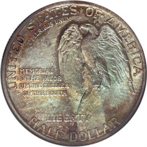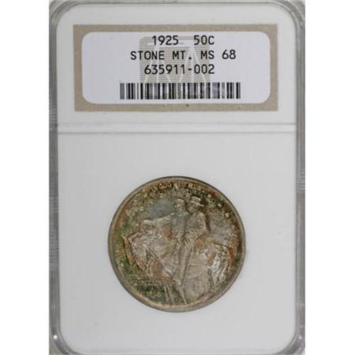 <B>1925 50C Stone Mountain MS68 NGC.</B></I> Certain scandals aside, the eminently forgettable President Warren G. Harding is most notable for dying in office. In navigating the Stone Mountain commemorative half dollar through Congress, the bill's sponsors declared that it would be dedicated to the memory of the recently deceased statesman. As various rejected iterations of the half dollar design traveled from Gutzon Borglum to the Commission of Fine Arts and back, the tribute to Harding (a nod to the Louisiana Purchase/McKinley dollar?) became less and less apparent, and in the final version, neither his name nor his likeness appears on either side.<BR> Shimmering luster, slightly more potent on the reverse, graces each side of this richly toned representative. The obverse exhibits mottled burgundy, apple-green, and silver-gray patina, while the reverse displays reddish-gold and greenish-gray with a diagonal swath of milky color at the center. Only 10 examples have been graded at MS68 by NGC, with none finer (11/07).<BR><I></B></I><BR><BR><b>Shipping:</b> Coins & Currency (<a target="_blank" href="http://www.heritageauctions.com/common/shipping.php">view shipping information</a>)