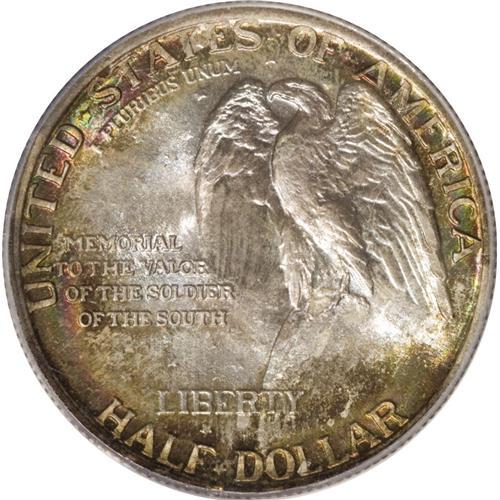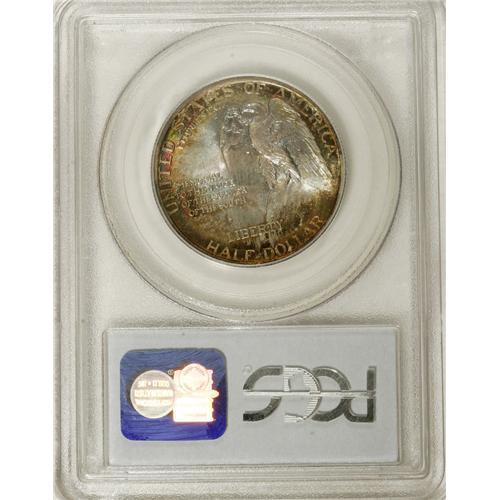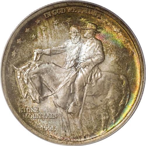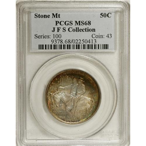<B>1925 50C Stone Mountain MS68 PCGS.</B></I> Ex: JFS Collection. The frequent disputes between Gutzon Borglum, the artist originally hired to plan and carve the memorial at Stone Mountain, and the various heads of the Stone Mountain Confederate Monumental Association took on soap-opera proportions as the two parties became more estranged. February and March 1925 saw the cliffhanger, wherein the association fired the artist, who retaliated by destroying his models and fleeing to North Carolina. Under Augustus Lukeman, the replacement sculptor, work foundered, and progress on Stone Mountain stopped amid accusations of financial mismanagement. A smaller version of the Stone Mountain Confederate Memorial would not open until 1970.<BR> On this captivating and strongly lustrous coin, deep ruby, bronze, and emerald patina graces the peripheral zones, while the powder-blue and lilac centers have tiny glints of silver-white. The surfaces are smooth and surprisingly distraction-free. When this example is placed next to a "mere" Gem, the difference is clear, and the overwhelming eye appeal of this MS68 becomes even more apparent. When this piece was last offered by Heritage in January 2005, the cataloger believed that it was "destined for the finest collection," and one need only look at the other pieces in this sale to know that the prediction came true. Population: 6 in 68, 0 finer (2/07).<BR><I>From The Cary & Cheryl Porter Collection.</B></I><BR><BR><b>Shipping:</b> Coins & Currency (<a target="_blank" href="http://www.heritageauctions.com/common/shipping.php">view shipping information</a>)
