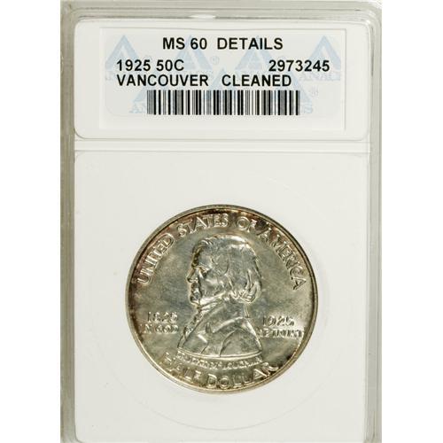 <B>1925 50C Vancouver--Cleaned--ANACS. MS60 Details.</B></I> NGC Census: (0/3724). PCGS Population (10/2699). Mintage: 14,994. Numismedia Wsl. Price for NGC/PCGS coin in MS60: $339. (#9399)<BR><BR><b>Shipping:</b> Coins & Currency (<a target="_blank" href="http://www.heritageauctions.com/common/shipping.php">view shipping information</a>)