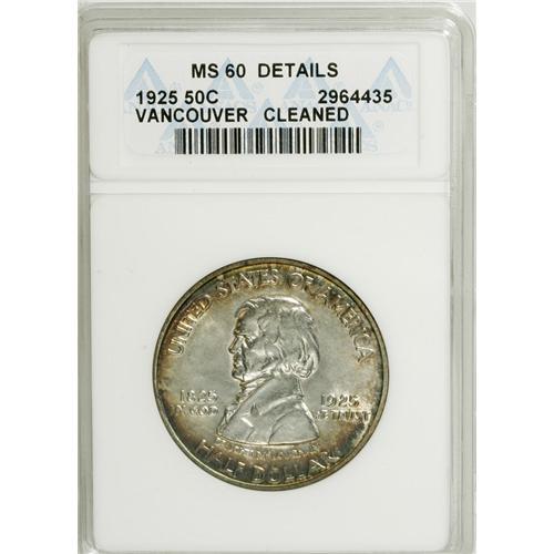 <B>1925 50C Vancouver--Cleaned--ANACS. MS60 Details.</B></I> NGC Census: (0/1858). PCGS Population (10/2699). Mintage: 14,994. Numismedia Wsl. Price: $339. (#9399)<BR><BR><b>Shipping:</b> Coins & Currency (<a target="_blank" href="http://www.heritageauctions.com/common/shipping.php">view shipping information</a>)