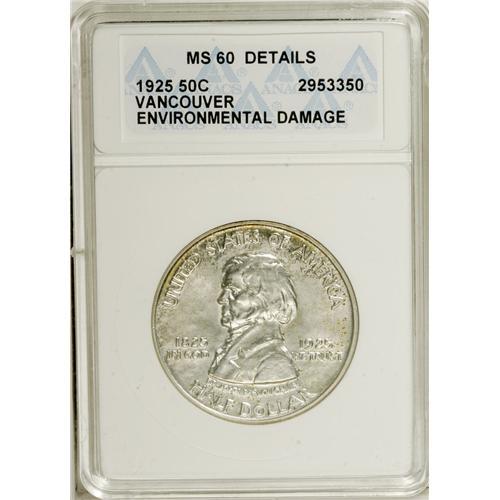 <B>1925 50C Vancouver--Environmental Damage--ANACS. MS60 Details.</B></I> NGC Census: (0/1849). PCGS Population (10/2699). Mintage: 14,994. Numismedia Wsl. Price: $339. (#9399)<BR><BR><b>Shipping:</b> Coins & Currency (<a target="_blank" href="http://www.heritageauctions.com/common/shipping.php">view shipping information</a>)