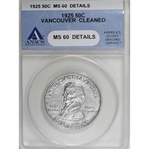 <B>1925 50C Vancouver--Cleaned--ANACS. MS60 Details.</B></I> NGC Census: (0/1904). PCGS Population (10/2736). Mintage: 14,994. Numismedia Wsl. Price for NGC/PCGS coin in MS60: $339. (#9399)<BR><BR><b>Shipping:</b> Coins & Currency (<a target="_blank" href="http://www.heritageauctions.com/common/shipping.php">view shipping information</a>)