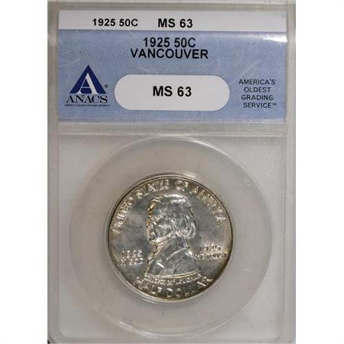 <B>1925 50C Vancouver MS63 ANACS.</B></I> NGC Census: (238/1590). PCGS Population (658/1877). Mintage: 14,994. Numismedia Wsl. Price for NGC/PCGS coin in MS63: $358. (#9399)<BR><BR><b>Shipping:</b> Coins & Currency (<a target="_blank" href="http://www.heritageauctions.com/common/shipping.php">view shipping information</a>)