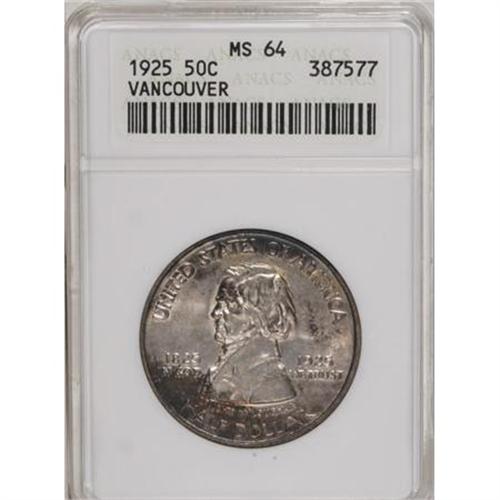 <B>1925 50C Vancouver MS64 ANACS.</B></I> NGC Census: (777/814). PCGS Population (936/942). Mintage: 14,994. Numismedia Wsl. Price for NGC/PCGS coin in MS64: $475. (#9399)<BR><BR><b>Shipping:</b> Coins & Currency (<a target="_blank" href="http://www.heritageauctions.com/common/shipping.php">view shipping information</a>)
