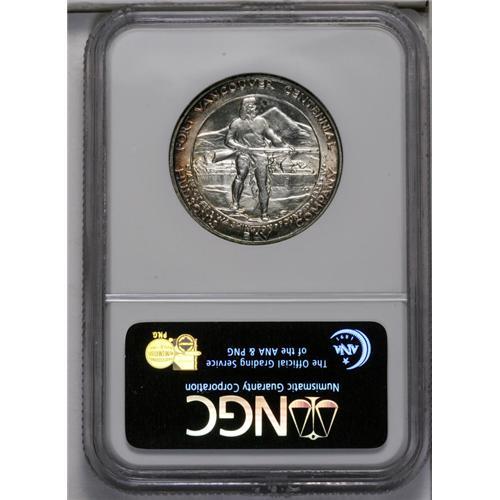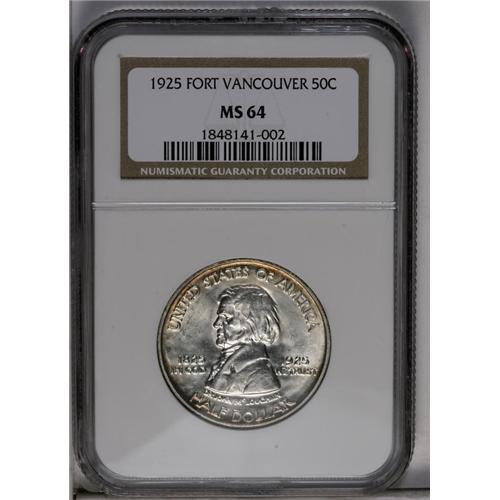 <B>1925<50C> Vancouver MS64 NGC.</B></I> Whispers of reddish-tan, lavender, and cobalt-blue toning hug the rims of this near-Gem commemorative. Lustrous surfaces are in receipt of a few minor marks, thus keeping the coin from full Gem.