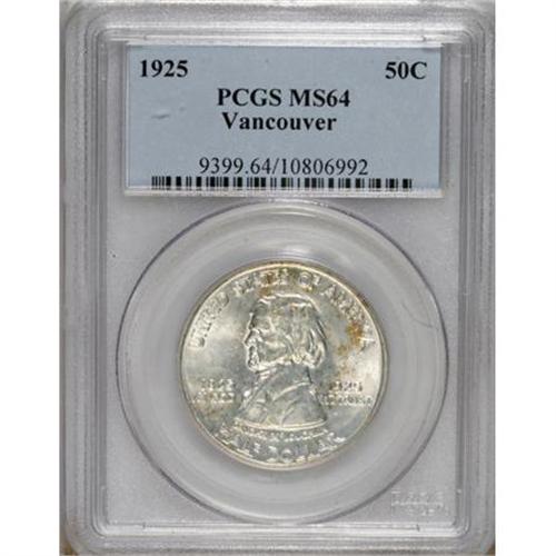 <B>1925 50C Vancouver MS64 PCGS.</B></I> PCGS Population (897/930). NGC Census: (762/788). Mintage: 14,994. Numismedia Wsl. Price for NGC/PCGS coin in MS64: $475. (#9399)<BR><BR><b>Shipping:</b> Coins & Currency (<a target="_blank" href="http://www.heritageauctions.com/common/shipping.php">view shipping information</a>)