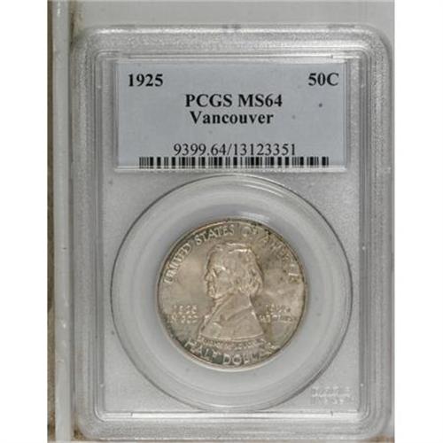 <B>1925 50C Vancouver MS64 PCGS.</B></I> PCGS Population (897/930). NGC Census: (762/788). Mintage: 14,994. Numismedia Wsl. Price for NGC/PCGS coin in MS64: $475. (#9399)<BR><BR><b>Shipping:</b> Coins & Currency (<a target="_blank" href="http://www.heritageauctions.com/common/shipping.php">view shipping information</a>)