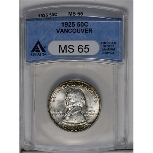 <B>1925<50C> Vancouver MS65 ANACS.</B></I> Fantastic luster adheres to both sides of this impeccably preserved Gem. Brilliant centers are highlighted by peripheral whispers of sea-green, gold-tan, and lavender, which are more pronounced on the obverse. Sharply struck throughout.