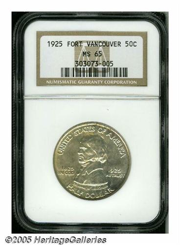 <B>1925<50C> Vancouver MS65 NGC.</B></I> Bright, lustrous surfaces display whispers of tan-gold patina in localized areas, and exhibit sharply struck design elements. A couple of minute marks on the frontiersman's left leg are mentioned for accuracy.