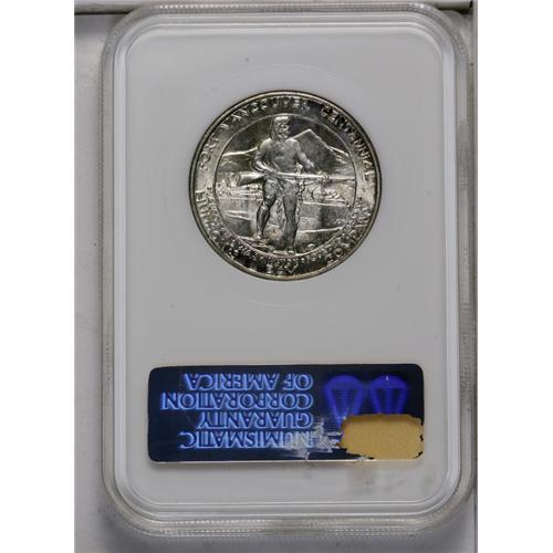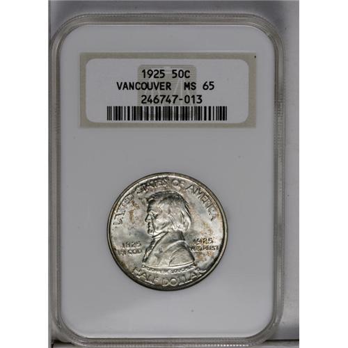 <B>1925<50C> Vancouver MS65 NGC.</B></I> Original gold and powder-blue toning adorns this lustrous and lovely Gem. The left portion of 1925 and WE TRUST is nicely die doubled. Housed in an early generation holder.