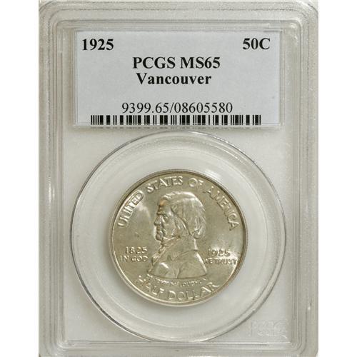 <B>1925 50C Vancouver MS65 PCGS.</B></I> A beautiful Gem whose light tan-gold surfaces lack consequential contact. A well struck and desirable example of this better silver commemorative type.<BR><BR><b>Shipping:</b> Coins & Currency (<a target="_blank" href="http://www.heritageauctions.com/common/shipping.php">view shipping information</a>)