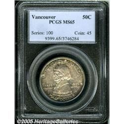 <B>1925 50C Vancouver MS65 PCGS.</B></I> Well struck with vibrant satin luster beneath richly toned lavender and sea-green surfaces. Other than a couple of small abrasions in the upper left obverse field, the piece seems nearly blemish-free. A highly attractive Gem.