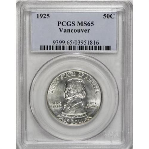 <B>1925 50C Vancouver MS65 PCGS.</B></I> Sparkling luster graces both sides of this Vancouver Gem, and just the faintest whispers of gold color visit the obverse. The design elements are well impressed. Some minute marks on the portrait of McLoughlin preclude an even finer grade.<BR><BR><b>Shipping:</b> Coins & Currency (<a target="_blank" href="http://www.heritageauctions.com/common/shipping.php">view shipping information</a>)