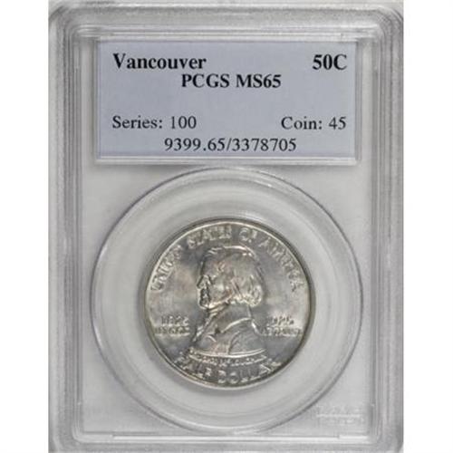 <B>1925 50C Vancouver MS65 PCGS.</B></I> Pleasingly detailed with delicate gold accents against the highly lustrous silver-white surfaces. An attractive Gem representative of this local-interest West Coast issue, struck at San Francisco but without a mintmark.<BR><BR><b>Shipping:</b> Coins & Currency (<a target="_blank" href="http://www.heritageauctions.com/common/shipping.php">view shipping information</a>)
