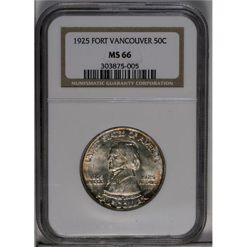 <B>1925<50C> Vancouver MS66 NGC.</B></I> The satiny surfaces show a moderate overlay of a light golden color on each side. Well balanced overall and a premium coin.