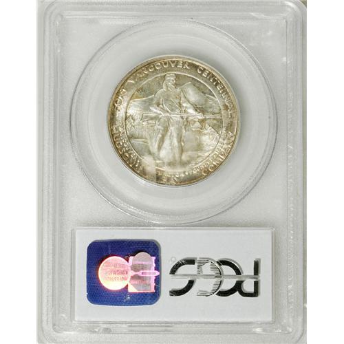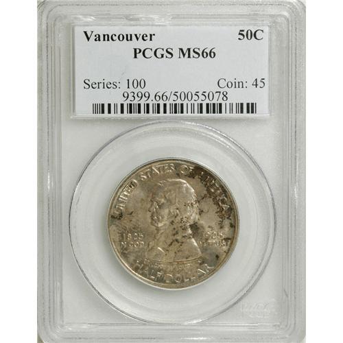 <B>1925 50C Vancouver MS66 PCGS.</B></I> A semi-key in the classic silver commemorative series, this Premium Gem example reveals golden-gray and russet patina over lustrous surfaces. The design features are well impressed, though portions of the background fort are a touch soft. A few light marks on the figure of the frontiersman are not bothersome. PCGS has seen just 45 specimens graded higher (3/07).<BR><BR><b>Shipping:</b> Coins & Currency (<a target="_blank" href="http://www.heritageauctions.com/common/shipping.php">view shipping information</a>)