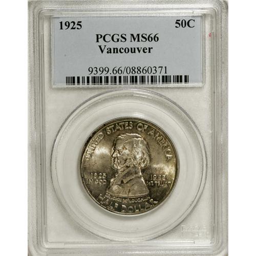 <B>1925 50C Vancouver MS66 PCGS.</B></I> Rose-gray toning covers the highly lustrous surfaces, yielding to green peripheral color on both sides. This Premium Gem is well struck and nearly blemish-free, save for a few unimportant nicks.<BR><BR><b>Shipping:</b> Coins & Currency (<a target="_blank" href="http://www.heritageauctions.com/common/shipping.php">view shipping information</a>)