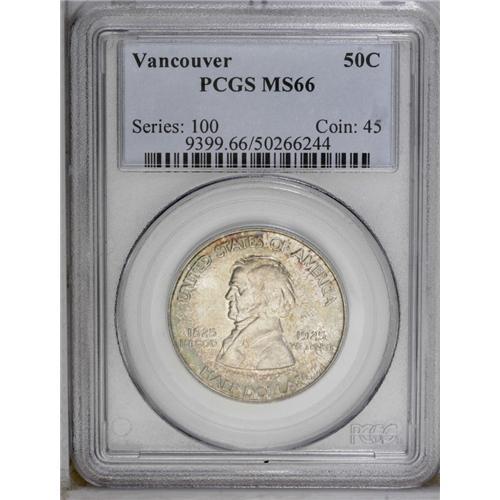 <B>1925<50C> Vancouver MS66 PCGS.</B></I> This is one of the most attractive Vancouver half dollars we have recently seen. Both sides are fully lustrous, with brilliant satin surfaces. Faint golden-brown and blue-green toning are visible across portions of each side. <BR><BR><B>Important notice:</B> Heritage usually auctions material at the rate of 200-250 lots per hour. On some occasions eBay Live bid software or the Internet may not be able to keep up with the pace of the auction. We recommend placing a realistic absentee bid now as insurance to avoid disappointment. Occasionally the auctioneer may eliminate or reject an eBay Live bid, and the auctioneer may also reopen a lot after the close of the eBay live bidding (usually because we missed an audience bid), and may reject your bid even if it shows you as the winning bidder. By bidding via eBay Live, you agree that Heritage may award the lot to another bidder at its sole discretion under the circumstances described above or any other reasonable circumstances. Since eBay bids are not shown to us until we open the lot on the floor, we treat those bids just like floor bids. In most cases the floor responds before the eBay bid is presented to us, due to Internet lag time, so for consistency we have made it a policy that floor bids are always considered first over tie eBay live bids. Also please note that all Heritage lots purchased through eBay Live carry a 20% Buyer's Premium. Please make sure you read the Terms and Conditions before you bid. This lot is being auctioned in conjunction with a live floor auction by Heritage Galleries & Auctioneers. All final auction and invoice information will be supplied by Heritage Galleries & Auctioneers, and all other information should be considered preliminary. Lot:5107 <BR><BR><B>Winning Notification and Billing:</B> After the FINAL session in this auction is complete, Heritage will send e-mail and snail mail invoices. This process normally takes several days. All final auction and invoice information will be supplied by Heritage Galleries & Auctioneers, and all other information should be considered preliminary. <BR><BR>This auction will be conducted on a live auction floor and over the Internet through eBay Live. If you choose to place an absentee bid, please take a moment to <font color='#0000ff'><u><a href='http://pages.ebay.com/liveauctions/help/before/laabsentee.html'>learn how eBay Live absentee bidding works</a></u></font><font color='#000000'>