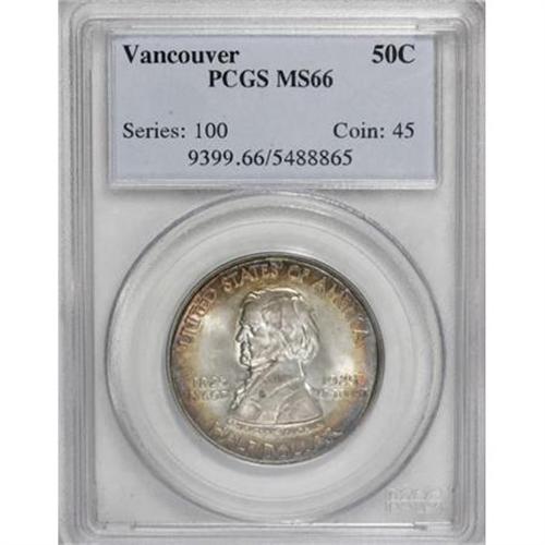 <B>1925 50C Vancouver MS66 PCGS.</B></I> A well struck and attractive representative of this West Coast issue that displays gold-orange patina around a brilliant center on the obverse. The reverse has atmospheric, dusky antique-gold and plum patina that drapes subtly lustrous surfaces.<BR><BR><b>Shipping:</b> Coins & Currency (<a target="_blank" href="http://www.heritageauctions.com/common/shipping.php">view shipping information</a>)