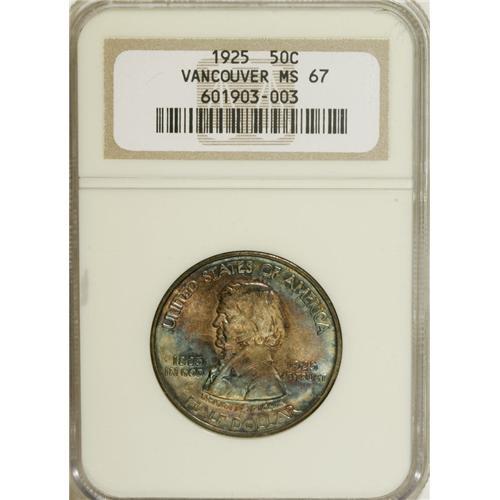 <B>1925 50C Vancouver MS67 NGC.</B></I> The San Francisco Mint struck two commemoratives in 1925, the California and Vancouver issues. While the California half displays an S mintmark below the D of DOLLAR, the Vancouver dies omitted the small but important feature. Mint-green, peach, ocean-blue, violet, and orange patina blankets each side of this enticing Vancouver half. Strongly lustrous with immense visual appeal that reflects decades of careful preservation.<BR><I>From The Cary & Cheryl Porter Collection.</B></I><BR><BR><b>Shipping:</b> Coins & Currency (<a target="_blank" href="http://www.heritageauctions.com/common/shipping.php">view shipping information</a>)