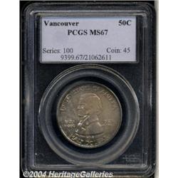 <B>1925<50C> Vancouver MS67 PCGS.</B></I> Typically seen toned, this example is no exception. Deep shades of gray and reddish-gold toning can be seen throughout the surfaces. This semi-key issue also shows a virtual lack of typically seen abrasions. Population: 41 in 67, 1 finer (3/04). <BR><BR><B>Important notice:</B> Heritage usually auctions material at the rate of 200-250 lots per hour. On some occasions eBay Live bid software or the Internet may not be able to keep up with the pace of the auction. We recommend placing a realistic absentee bid now as insurance to avoid disappointment. Occasionally the auctioneer may eliminate or reject an eBay Live bid, and the auctioneer may also reopen a lot after the close of the eBay live bidding (usually because we missed an audience bid), and may reject your bid even if it shows you as the winning bidder. By bidding via eBay Live, you agree that Heritage may award the lot to another bidder at its sole discretion under the circumstances described above or any other reasonable circumstances. Since eBay bids are not shown to us until we open the lot on the floor, we treat those bids just like floor bids. In most cases the floor responds before the eBay bid is presented to us, due to Internet lag time, so for consistency we have made it a policy that floor bids are always considered first over tie eBay live bids. Also please note that all Heritage lots purchased through eBay Live carry a 20% Buyer's Premium. Please make sure you read the Terms and Conditions before you bid. </span></font></tr></table></td></tr></table>