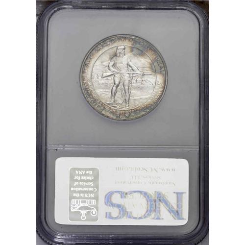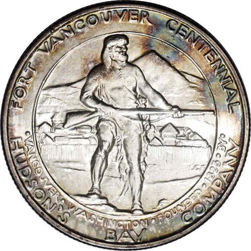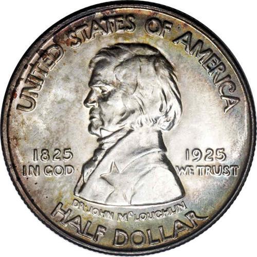 <B>1925<50C> Vancouver--Obverse Improperly Cleaned--NCS. Unc. Details.</B></I> Satiny luster. Both surfaces are partially brilliant with blushes of intense golden-brown, electric blue, pewter gray, and lilac. Dr. John McLoughlin, popularly referred to a the "father of Oregon," is depicted on the obverse. Although struck at the San Francisco, the S-mintmark was omitted from the designs.