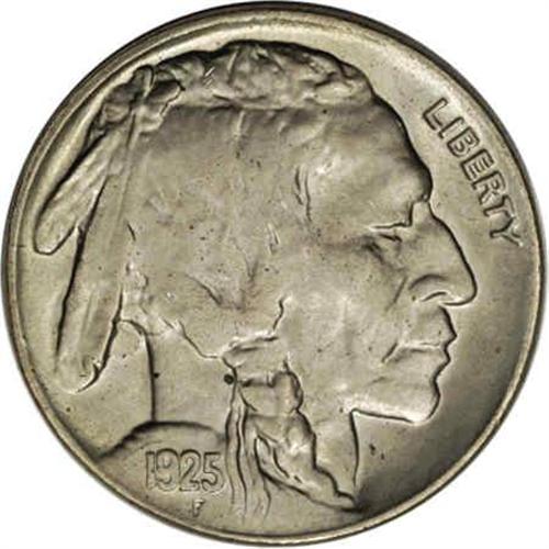 <B>1925<5C> MS64 NGC.</B></I> Very smooth, satiny surfaces that are lightly toned and essentially blemish-free, except for two or three wispy marks on the bison's shoulder and torso. There are scattered flyspecks on each side, and an interesting die crack (as struck) extends from the left reverse rim, through the bison's horn, and to the center of the bison's shoulder.