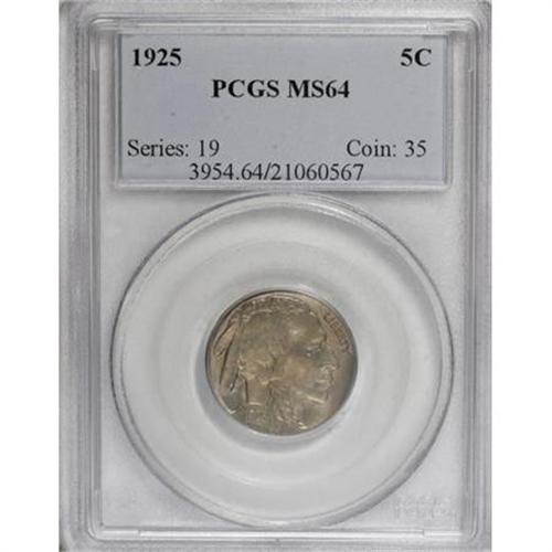 <B>1925 5C MS64 PCGS.</B></I> PCGS Population (523/563). NGC Census: (313/230). Mintage: 35,565,100. Numismedia Wsl. Price for NGC/PCGS coin in MS64: $132. (#3954)<BR><BR><B>Coin Engraver:</B> James E. Fraser<BR><BR><b>Shipping:</b> Coins & Currency (<a target="_blank" href="http://www.heritageauctions.com/common/shipping.php">view shipping information</a>)