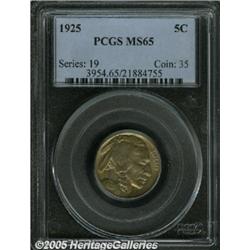 <B>1925 5C MS65 PCGS.</B></I> A delightful Gem example with soft, frosty luster and attractive golden-olive color. Although this is not a rare date, it is decidedly difficult to locate in Gem condition. The specialist will be pleased with this opportunity.