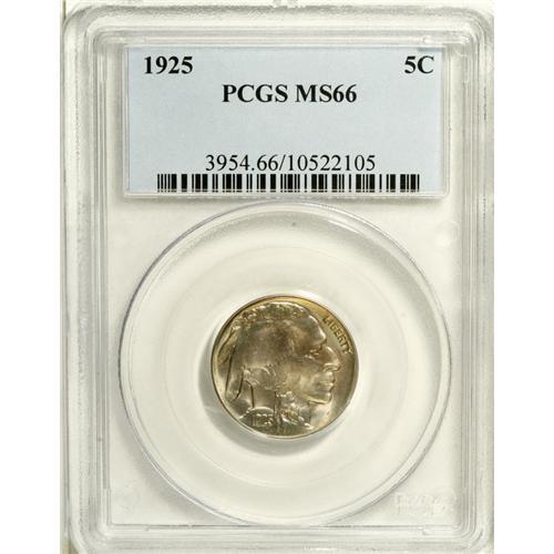 <B>1925 5C MS66 PCGS.</B></I> A remarkable and fully brilliant Premium Gem with frosty nickel-gray luster and faint golden toning. PCGS has only certified three finer examples of the date (12/06).<BR><BR><b>Shipping:</b> Coin/Currency (<a target="_blank" href="http://www.heritageauctions.com/common/shipping.php">view shipping information</a>)