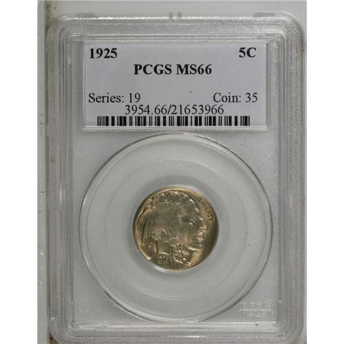 <B>1925 5C MS66 PCGS.</B></I> Exceptionally brilliant for the date with soothing, soft green-golden coloration. Nicely struck in the centers with slight softness seen on the obverse edges. PCGS has graded just two pieces finer (9/06).<BR><BR><b>Shipping:</b> Coin/Currency (<a target="_blank" href="http://www.heritageauctions.com/common/shipping.php">view shipping information</a>)