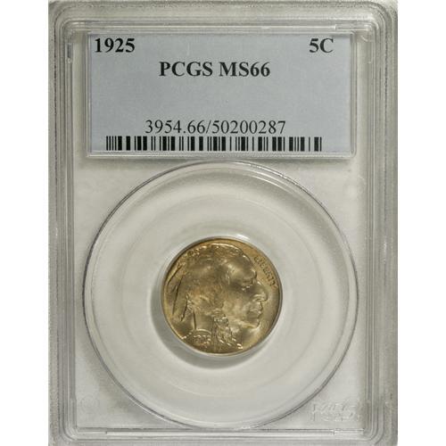 <B>1925 5C MS66 PCGS.</B></I> The typically seen frosty luster, along with delicate golden-gray patina, enlivens both sides of this P-mint Buffalo nickel. Sharp definition is noted on the design features, and there are no mentionable marks to report. Challenging in the Premium Gem level of preservation, and quite rare any finer.<BR><BR><b>Shipping:</b> Coins & Currency (<a target="_blank" href="http://www.heritageauctions.com/common/shipping.php">view shipping information</a>)
