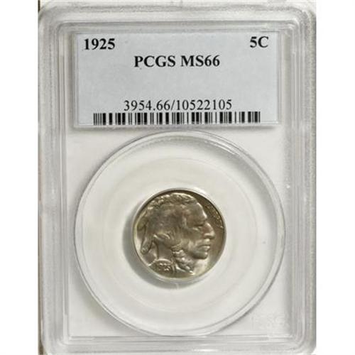 <B>1925 5C MS66 PCGS.</B></I> A remarkable and brightly lustrous high grade 1925 with frosty nickel-gray luster and faint golden and blue toning. PCGS has only certified five finer examples of this date (8/07).<BR><BR><B>Coin Engraver:</B> James E. Fraser<BR><BR><b>Shipping:</b> Coins & Currency (<a target="_blank" href="http://www.heritageauctions.com/common/shipping.php">view shipping information</a>)