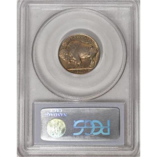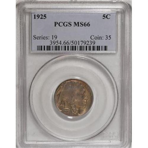 <B>1925 5C MS66 PCGS.</B></I> Luminous coral-red and steel-blue dominate this immaculate Buffalo nickel, sharply struck with an aura of originality. Remarkable eye appeal for this Philadelphia issue. PCGS has certified six finer pieces (1/08).<BR><BR><B>Coin Engraver:</B> James E. Fraser<BR><BR><b>Shipping:</b> Coins & Currency (<a target="_blank" href="http://www.heritageauctions.com/common/shipping.php">view shipping information</a>)