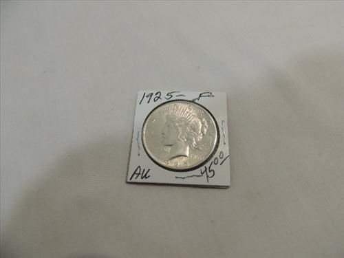 1925 ABOUT UNCIRCULATED PEACE SILVER DOLLAR. NICE SOLID STRIKE. FULL FEATHERS. AS SHOWN. VIEW PICTURE FOR DETAIL.