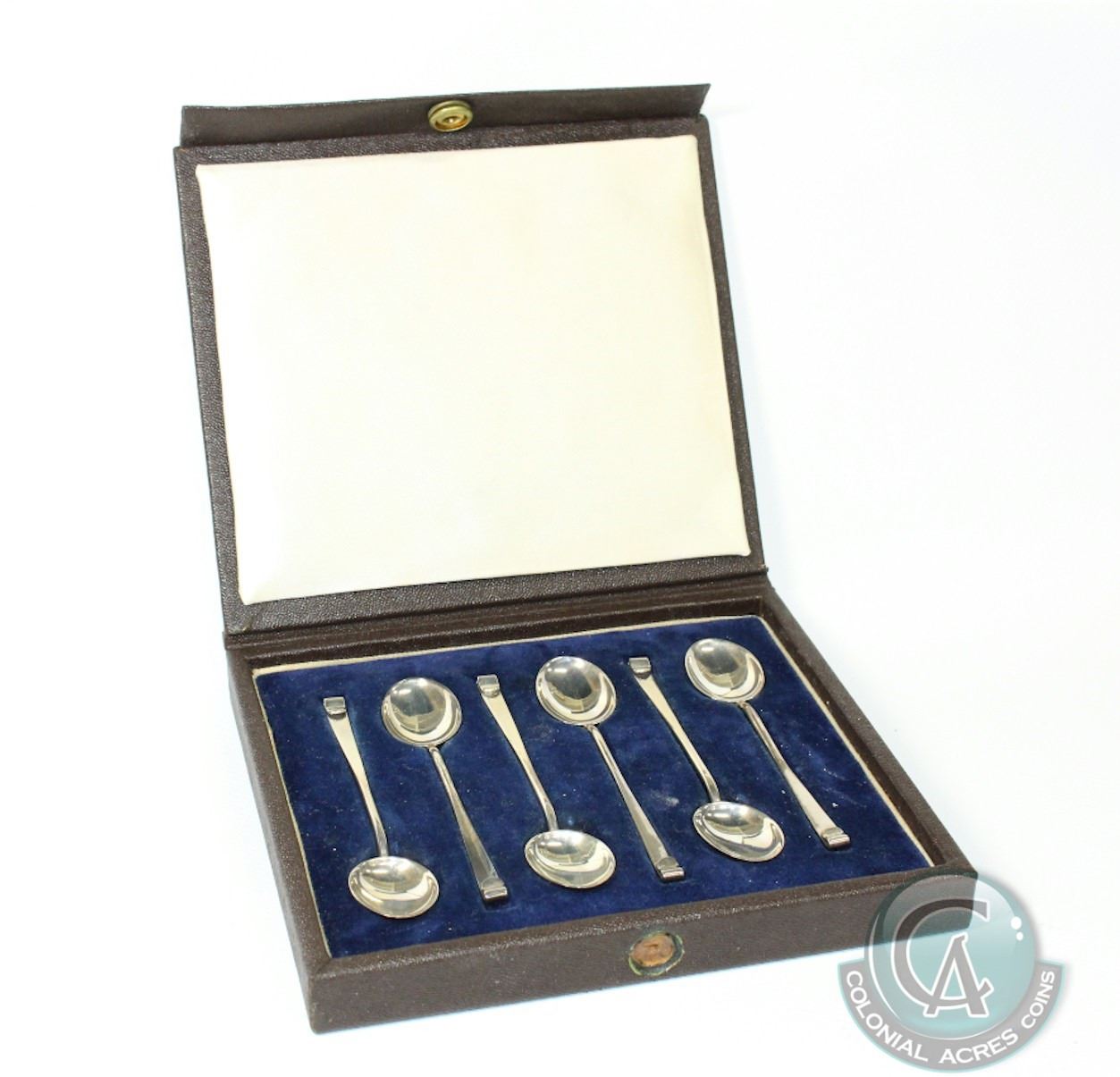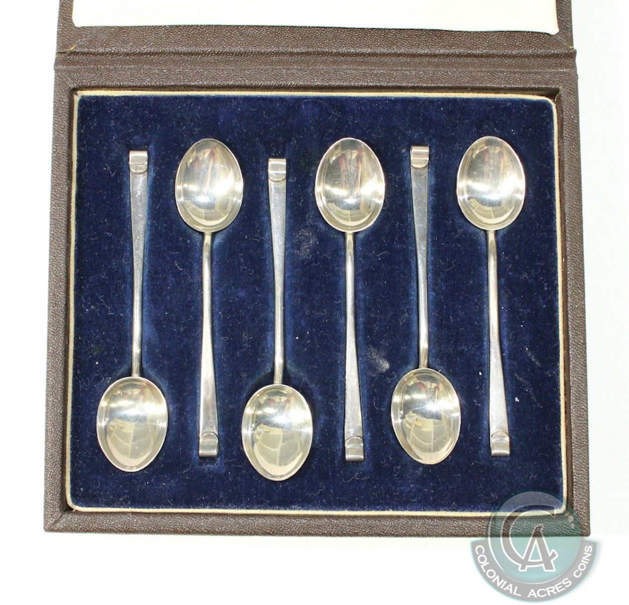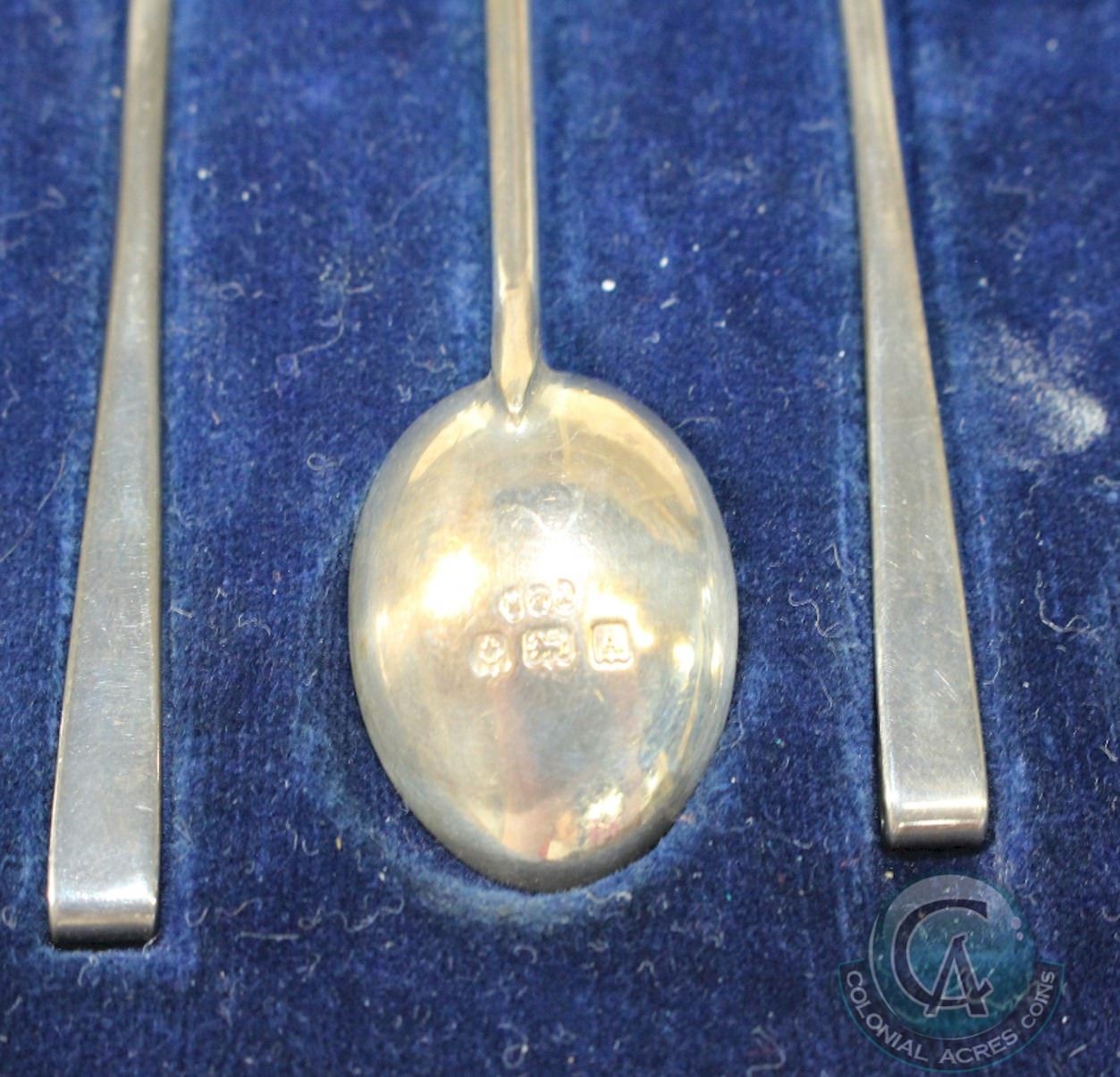 1925 Birmingham; Demi-tasse 6-spoon set in Original Case. Spoons measure just over 3 1/2 inches in length. Total weight of all spoons are 39 grams. Maker Marks appear to be by Hukin & Heath Ltd. Button on case has loosened off.
