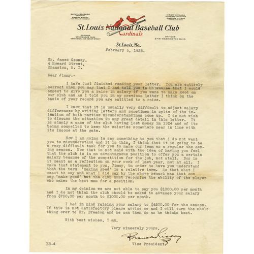 <B>1925 Branch Rickey Signed Letter.</B></I> Intriguing typed letter dated February 5, 1925 on St. Louis Cardinals team letterhead derives from the Hall of Fame executive's service as vice president and manager of the club. He writes a carefully worded letter to shortstop Jimmy "Scoops" Cooney, discussing matters of salary and Cooney's prospects of making the roster for the 1925 season. The closing black fountain pen signature is simply unimprovable, and the page is likewise in marvelous shape, with original mailing folds. An appealing way to bring this essential autograph into your collection. <I>LOA from PSA/DNA. LOA from James Spence Authentication.</B></I><BR><BR><b>Shipping:</b> Flat Material, Small (<a target="_blank" href="http://www.heritageauctions.com/common/shipping.php">view shipping information</a>)