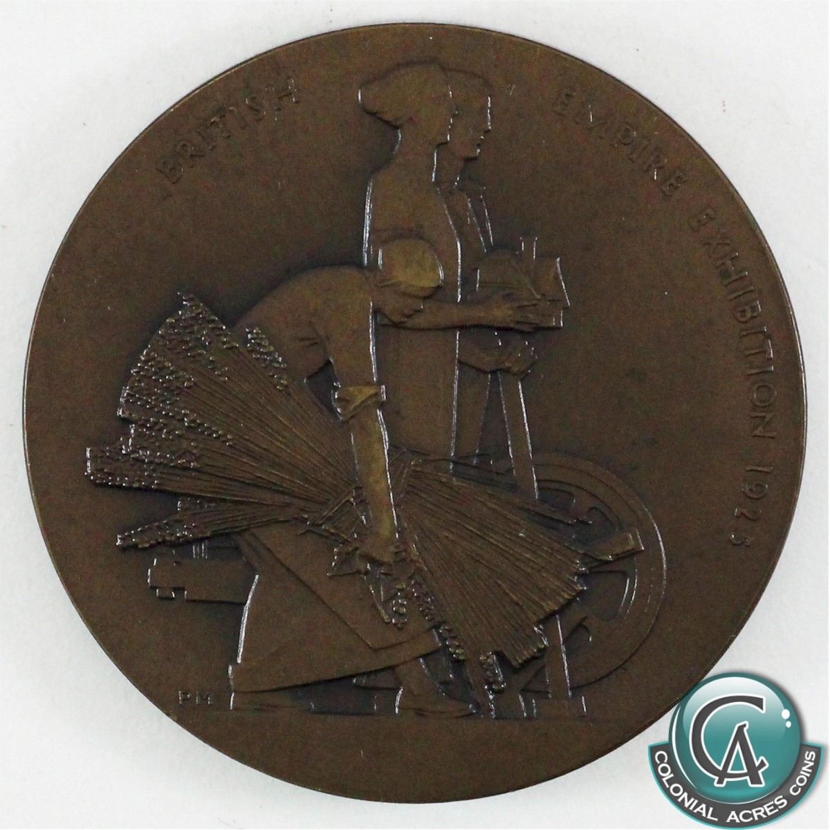 1925 British Empire Exhibition Copper Medallion, featuring George V on the obverse and three stylized figures standing right holding objects symbolizing food, transport, and housing. Copper Medal is 55mm in diameter and was made by B. Mackennal/P. Metcalfe (Elmer Cat# 1997). Medallion is in excellent Uncirculated condition and is a nice rich chocolate brown colour.